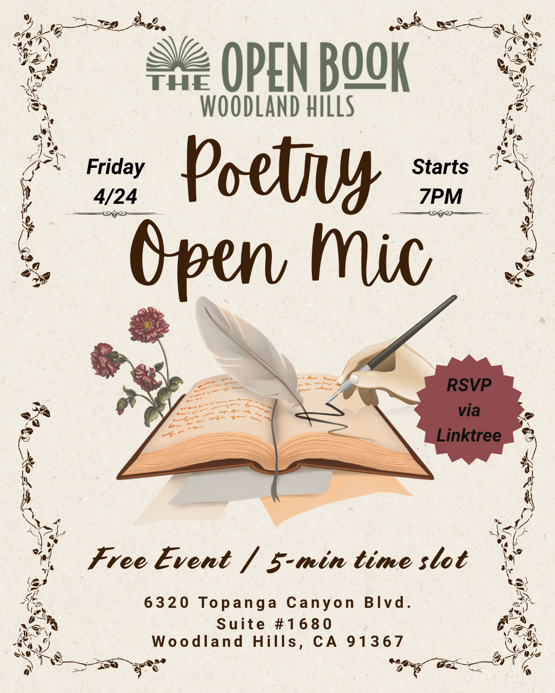 We are located right by the central courtyard of The Village Mall, across the street from Westfield Topanga. This outdoor mall enhances the intimate vibes. You can grab an ice cream, pick up a cup of coffee, hang out with the birds, and relax by the koi pond before popping in to find a fresh book to read. We also love pets. Cats, dogs, and whatever other critters you might have are always welcome.